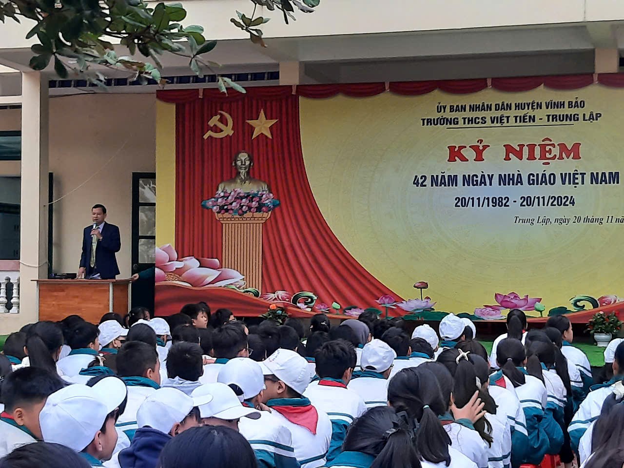 Sáng ngày 09/12/2024, Trường THCS Việt Tiến Trung Lập long trọng tổ chức chào cờ tháng 12 ở 02 cơ sở nhằm đánh giá tháng 11 và triển khai công tác táng 12. Tới dự cơ sở 01 có các đồng chí Trần Thị Sơn - Phó bí thư chi bộ, phó hiệu trưởng, Tới dự cơ sở 02 có các đồng chí Phạm Tiên Ba - Bí thư chi bộ, hiệu trưởng nhà trường cùng tất cả các đồng chí công nhân viên hội đồng sư phạm. Sau khi nghe Đồng chí Bùi Thị Lan, Vũ Thị Chinh – Tổng phụ tránh đánh giá nhận xét công tác tháng 11 và triển khai nội dung trọng tâm tháng 12 đặc biệt việc ôn luyện chuẩn bị kiểm tra cuối kỳ 01 và đọc quyết định khen thưởng tập thể các lớp, cá nhân xuất sắc trong tháng 11. Tiêu biểu ở cơ sở 01 có 06 chi đội đó là chi đội 7A1, 6B1, 6D1, 8A1, 6C1, 7D1, cơ sở 02 có 06 chi đội 9B2, 8A2, 6A2, 7B2, 7C2, 6C2. Tiếp đến các đồng chí lãnh đạo nhà trường chúc mừng thành tích của cá nhân và tập thể các chi đội, đồng thời nhắc nhở quán triệt căn dặn các em học sinh thực hiện tốt việc học tập và rèn luyện nền nếp đạo đức trong tháng. Sau đây là một vài hình ảnh trong buổi lễ.