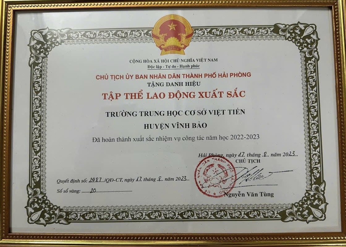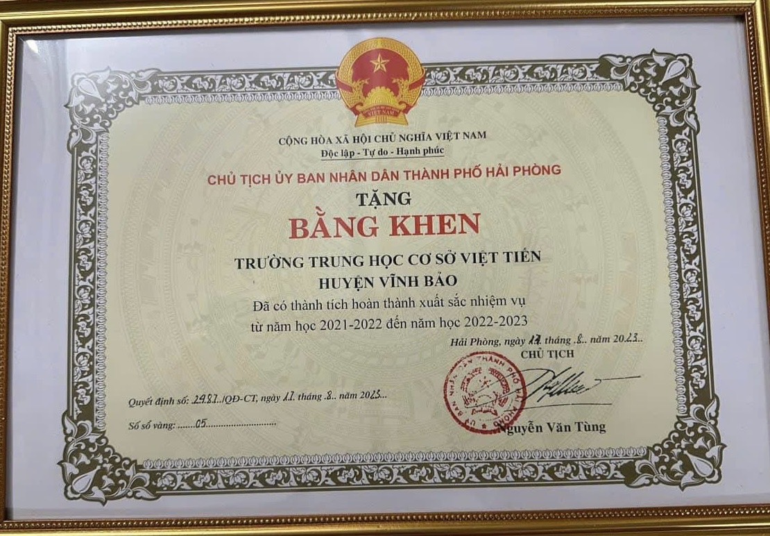 Trường THCS Việt Tiến được UBND thành phố tặng bằng khen Tập thể hoàn thành xuất sắc năm học: 2023-2024.