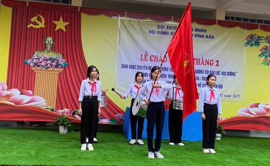 Thực hiện công văn số 04-KH/HĐĐ huyện Vĩnh Bảo về việc tổ chức Lễ chào cờ Đội cấp liên đội, kiểm tra Nghi thức Đội và Hồ sơ sổ sách Đội năm học 2024 - 2024. Nhằm nâng cao chất lượng thực hiện Nghi thức Đội Thiếu niên tiền phong Hồ Chí Minh, góp phần giáo dục toàn diện nhân cách cho thiếu nhi. Liên đội Trường THCS Việt Tiến – Trung Lập long trọng tổ chức Lễ chào cờ cấp Liên đội tháng 2 và sinh hoạt Liên đội theo chủ điểm “Xây dựng tình bạn đẹp, nói không với bạo lực học đường” vào sáng ngày 17/02/2025 về dự Lễ chào cờ có Anh Nguyễn Văn Tuấn - Phó bí thư huyện đoàn, Phó chủ tịch hội đồng đội huyện Vĩnh Bảo; Anh Nguyễn Công Đoàn – Bí thư đoàn thanh niên, Chủ tịch hội đồng đội TNTP Hồ Chí Minh xã Trung Lập; Chị Trần Thị Ngân - Bí thư đoàn thanh niên, Chủ tịch hội đồng đội TNTP Hồ Chí Minh xã Việt Tiến; Các đồng chí đại diện cho BTV huyện đoàn, Ban chủ nhiệm CLB TPT Đội huyện; nhà giáo Phạm Tiến Ba - Bí thư chi bộ - Hiệu trưởng nhà trường, nhà giáo Trần Thị Sơn- Phó bí thư chi bộ - Phó hiệu trưởng nhà trường cùng các nhà giáo trong hội đồng sư phạm nhà trường, các em đội viên cơ sở 2 đại diện cho 1136 bạn đội viên trong toàn liên đội. Nội dung buổi lễ: - Đánh giá kết quả hoạt động trong tháng 1; Triển khai nhiệm vụ tháng tới; Sinh hoạt liên đội theo chủ điểm “Xây dựng tình bạn đẹp và nói không với bạo lực học đường”; Thi nghi thức đội. Ngoài ra liên đội phát quà đầu năm nhằm sẻ chia động viê